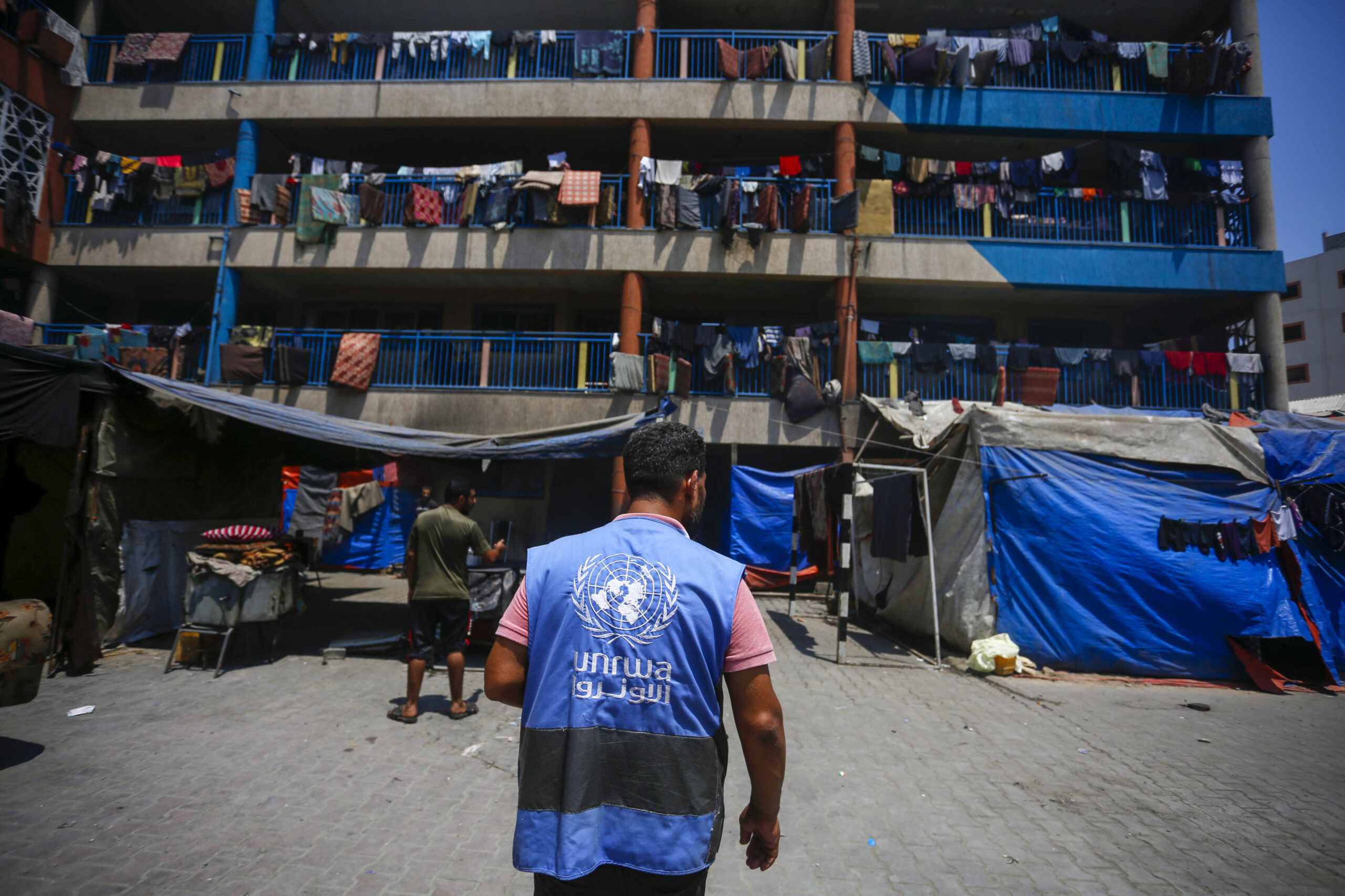 GAZA CITY, GAZA - JULY 15: UNRWA employees and Palestinians inspect a damaged school after Israeli fighter jets hit United Nations Relief and Works Agency for Palestine Refugees in the...