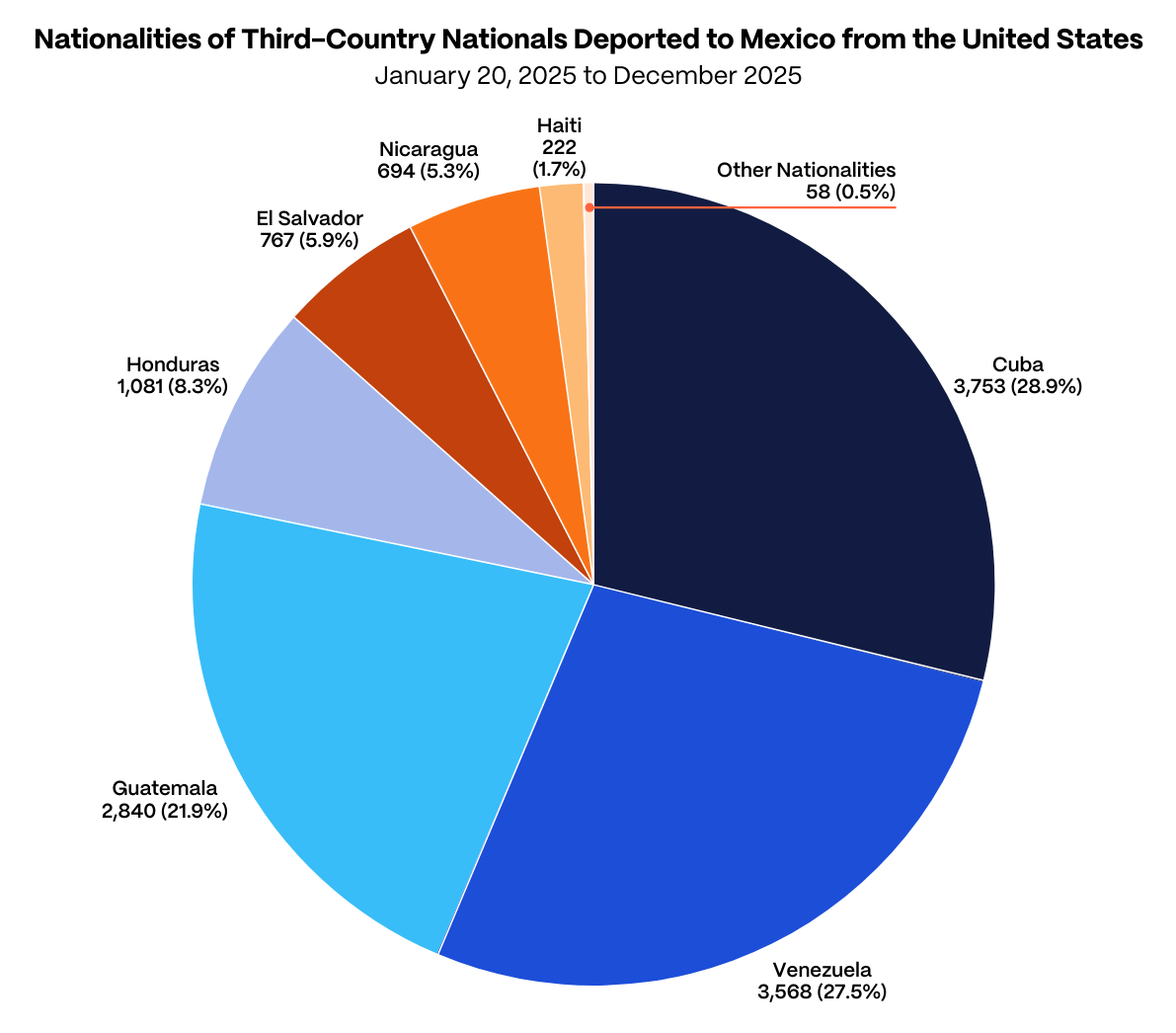 Despite the Trump administration ending the CHNV and CBP One pathways, the Mexican government has accepted deportees of the same seven nationalities from the United States in 2025. Just as in the past, the Mexican government has not been transparent about its collaboration with the United States; its Unidad de Politica Migratoria does not publish statistics on who it is agreeing to receive. According to information requests made to the INM by the organization IMUMI, between January 20, 2025, and December 31, 2025, Mexico received at least 12,983 non-Mexican nationals from the United States. A breakdown of these deportees by nationality through December 31, 2025 is 3,753 Cubans, 3,568 Venezuelans, 2,840 Guatemalans, 1,081 Hondurans, 767 El Salvadorans, 694 Nicaraguans, and 222 Haitians. Cuban deportations to Mexico dramatically increased, especially in the fall of 2025; from September to November, Cubans comprised the majority of the deportees to Mexico.