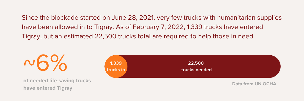 The humanitarian situation in Ethiopia’s northern region of Tigray is nothing short of abysmal. Atrocities amounting to war crimes have led to the forced displacement of nearly 2.5 million people inside Ethiopia and into neighboring states. The Ethiopian government has blocked virtually all food and medical shipments into Tigray, using food as a weapon of war. With starvation deaths mounting each day and as many as 900,000 people in famine conditions, there are fears that the current situation in Ethiopia will mirror the Great Famine of the 1980s, where over 1 million people starved to death.